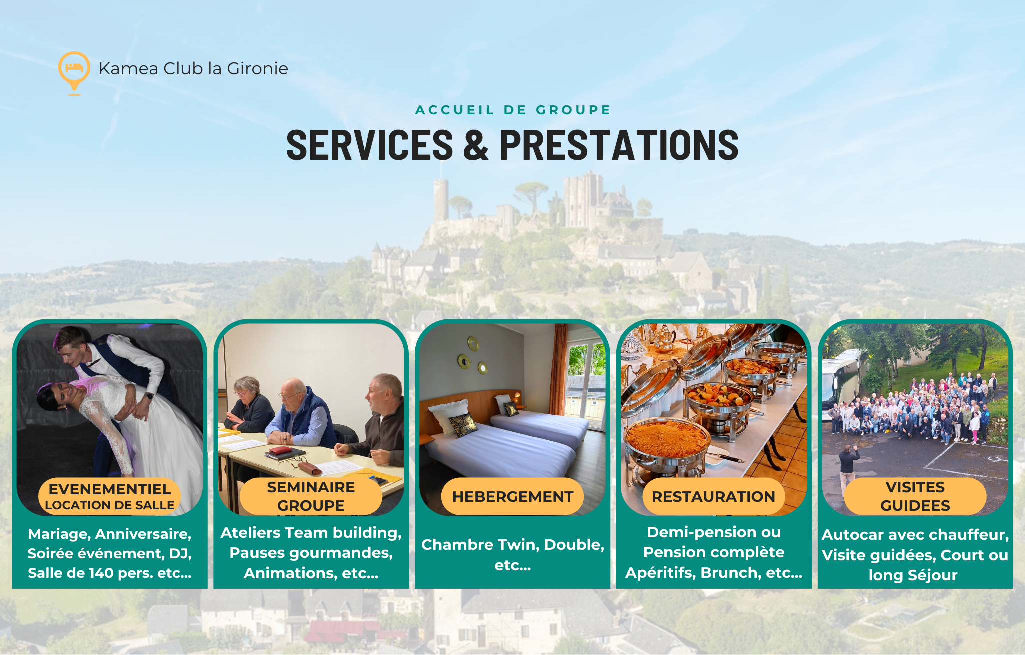 Nous organisons votre séjour de plusieurs nuitées, à partir de 20 personnes, avec hébergement, restauration, visites guidées et transport, selon vos préférences et votre convenance.